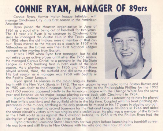 Unmentioned in the little story above is the fact that Ryan finished third in the National League in doubles for 1947, while playing for the Boston Braves. Ryan would later serve as interim manager for two major league teams, the 1975 Atlanta Braves, and the 1977 Texas Rangers. His composite major league record was 11 - 22. Ryan passed away January 3, 1996, at his home in Metairie, LA.