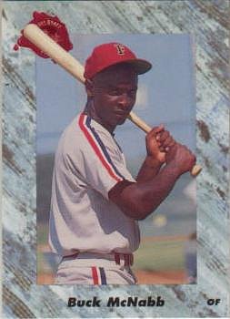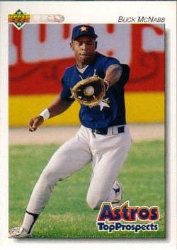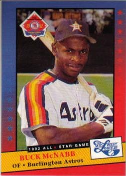 | Really not sure why McNabb never got a shot; he was a minor-league All-Star twice, once as you see here at Burlington in 1992, and also at Osceola the following year, the average was good, the speed was outstanding, and the strikeout numbers were not unreasonable, either. McNabb led the 1992 Burlington Astros (and the entire farm system, as well) with 56 steals, led the 1993 Osceola Astros in the same category, led the '94 Jackson Generals in hits, games, and steals, and hit over .285 four times during his Astro career, including once at the AA level. Kicked out of the organization in a deal that netted the Astros Mitch Meluskey from the Indians, McNabb rejoined the organization a year later as a free agent. Yet still, he got all of 19 at bats for even a AAA ballclub. Hard to imagine that a guy who stole as many bases as McNabb did would have had an effort or attitude problem, and if not, you kind of have to say that the man might have been jobbed more than a little bit. . . . |