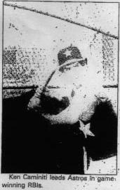 An injury prevented him form playing football in college, but Caminiti figured all along baseball was his best sport. Based on his performance this season, it's hard to believe the one-year delay hampered Caminiti's development. He is a big reason the Astros won the Central Division crown.Caminiti led the league in RBI's, doubles and scoring most of the season until a combination of a shoulder injury and an Astros' team slump left him with few opportunities to score on knock in runs. Even with the problems, he batted .275, and leads the team with 10 game-winning RBIs. "I'm a little dissatisfied," he said of his statistics. "The shoulder was part of it. It didn't bother me when I swung, but I had to DH a lot and it's tough to stay in the game when you're coming off the bench." Caminiti strained his throwing shoulder in an early season game at Fort Myers. "I had to make a throw across my body. It felt funny after I threw it, and the next day it was sore." After three months of treatment, Caminiti said the shoulder is back to normal. Osceola manager Dave Cripe feels Caminiti has the tools to advance up the minor league ladder. "he has one of the better arms I've seen when he's healthy," Cripe said. "He has good hands and good reactions defensively. As for his hitting, he's still learning to switch. He doesn't have what |